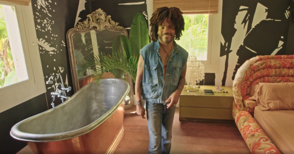 Of course, a rockstar of Lenny’s status would have an amazing master bedroom. It’s a suite, living room, and bedroom all-in-one. Interestingly enough, his bed is from the late 60s. A copper bathtub was made specially for his bedroom. There are also Brazilian chairs made from wood in the center of the room.
