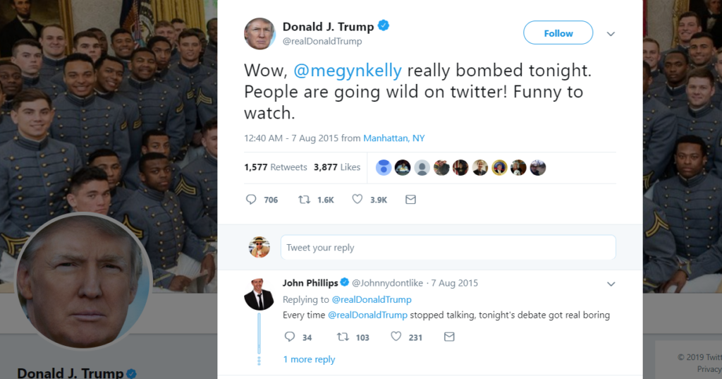 During the 2015 Republican Primary Debate, Kelly confronted Trump on a number of issues – including a quote in which he allegedly referred to some women he didn’t like as ‘fat pigs, dogs, slobs and disgusting animals.’ Trump not only criticized Kelly on social media, but he also did it repeatedly in other media interviews.